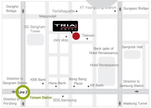 The stylish Tria Hotel is located near Teheran Street near Yeoksam Station and Rennaisance Hotel Seoul, right in the heart of Gangnam. The hotel aims to become a favorite place for guests who wish to enjoy High-end Lifestyle and those business travelers who prefer convenience & elegance. With a boutique hotel concept, Hotel Tria provides guests opportunities to experience its unique sense of interior design and prudent services for a comfortable and enjoyable stay.