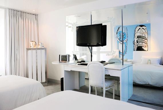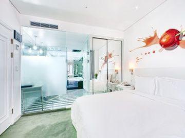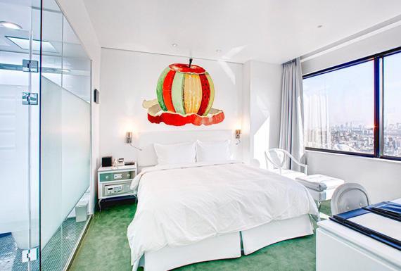 Hvis der er nogen tvivl om, at en byomfattende designpris kan få et stilfuldt hotel til at skyde op natten over, skal du bare se på IP Boutique Hotel. Denne kunstneriske luksusejendom, der erstatter det kedelige Itaewon Hotel, er uundgåelig fra gaden takket være sin legende Lego-stil farvede glasfacade, skabt af en avantgarde designprofessor ved Seouls Hongik University. Indretningen er lige så eventyrlig: lobbyen har grønne puder på lavt hængende gynger, oversize lamper, korsformede hvide vinylsofaer og japansk mixed-media kunst af Shintaro Ohata. En mindeværdig tur op ad elevatoren - der ligner en gigantisk kuffert - fører dig op til en af de 133 chikke værelser: is-hvidt interiør bliver punkteret af røde tæpper og levende popkunst; mens badeværelser er gennemsigtigt glas, fra brusere til håndvaske og vandhaner. De fleste de resistance er IP's udendørs karbad.