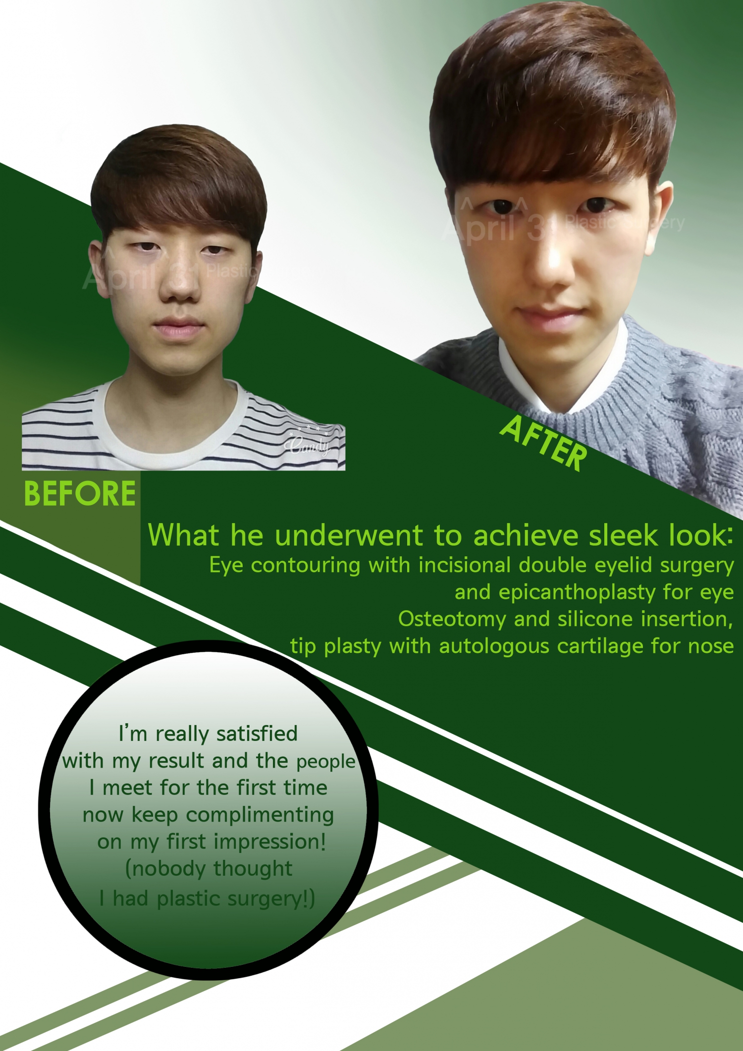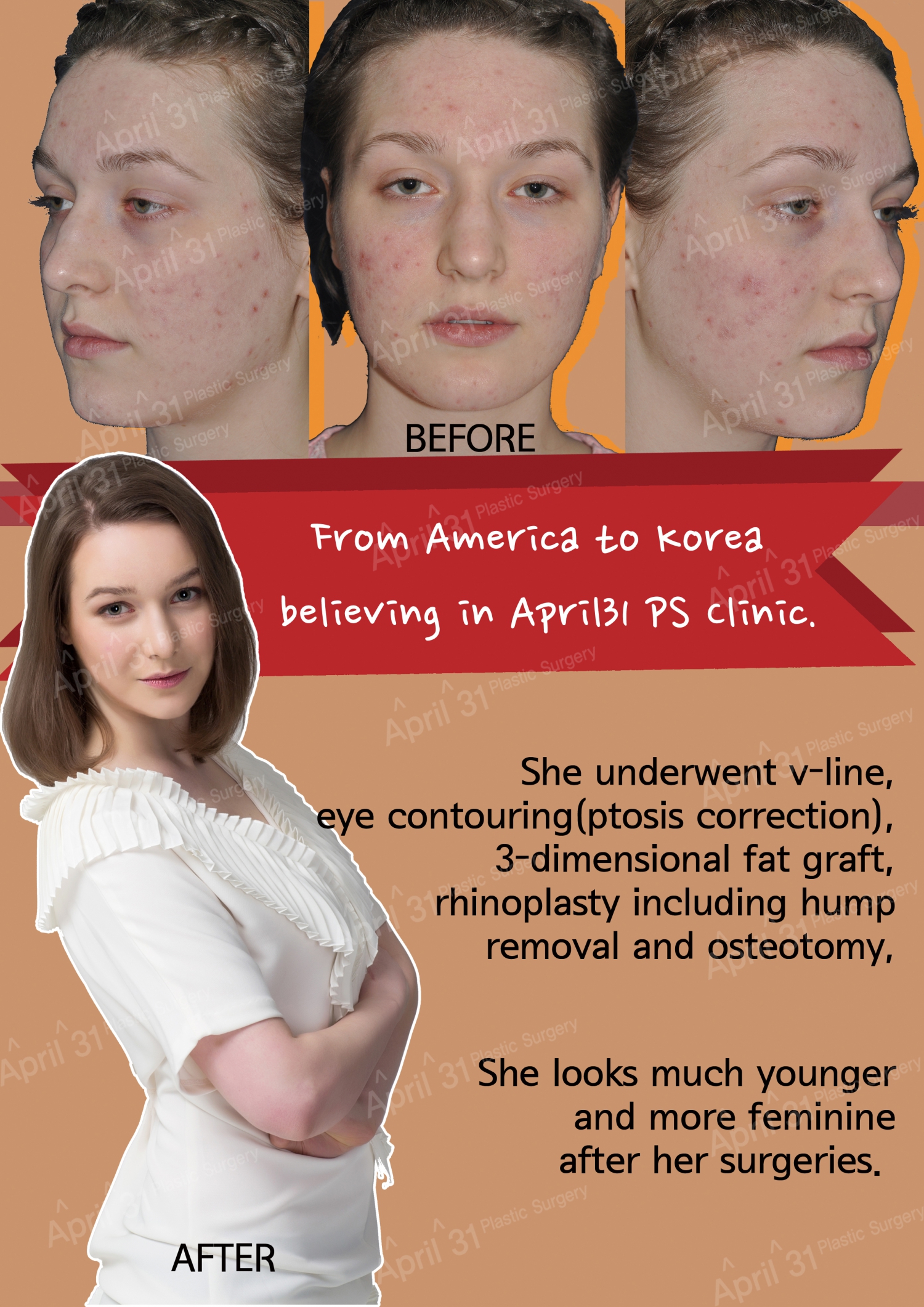 April 31 Plastiikkakirurgiaklinikka tarjoaa yleistä plastiikkakirurgiaa, kuten nenä-, silmä-, kasvojen muotoilu-, vartalon muotoilu- ja nuorentamisleikkauksia. Heidän mukaansa 'Jos mietit sitä, huhtikuun 31. päivää ei ole kalenterissa. Huhtikuun 31. plastiikkakirurgiaklinikka päivittää viehätysvoimaasi ja laatua kuin kaunis kukka, joka puhkeaa piristävänä kevätpäivänä ja antaa sinun syntyä uudelleen omalla kauneudellasi, jotta voit saada toisen syntymäpäiväsi.'
