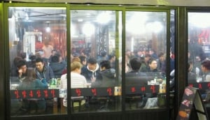 ristoranti a Seul. Alcuni vicoli sono interamente dedicati al maiale. Questo è uno di questi posti situato in un vicolo di maiale. Questo ristorante è affollato un martedì sera di febbraio e si specializza nel maiale proveniente dall'isola di Jeju allevato da maiali neri, un tipo di maiale di cui i coreani sono orgogliosi e considerano di qualità premium. Da provare quando sei qui, meglio consumato con una bottiglia del tanto amato liquore locale - Soju.
